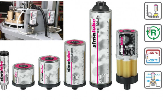 Simalube предлагает одноточечные автоматические лубрикаторы в 5 размерах (15, 30, 60, 125, 250 мл) и многоточечные устройства. Они оснащаются компактными элементами питания и могут быть заполнены до 3 раз. Прозрачный корпус позволяет держать процесс расхода под контролем. Цикл дозирования подбирается в соответствии с необходимостью (1-12 месяцев).