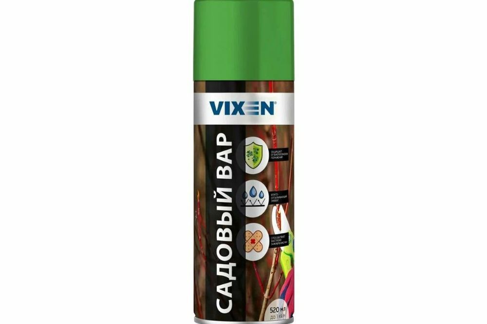 - Садовый вар в виде спрея бренда VIXEN. Он просто и равномерно наносится, создает защитный слой, который помогает растениям бороться с паразитами и болезнями, обеспечивает здоровый рост насаждений. Может наноситься для дополнительной защиты на места среза веток и стволов для их защиты от заболеваний и скорейшего восстановления естественного защитного покрытия.
