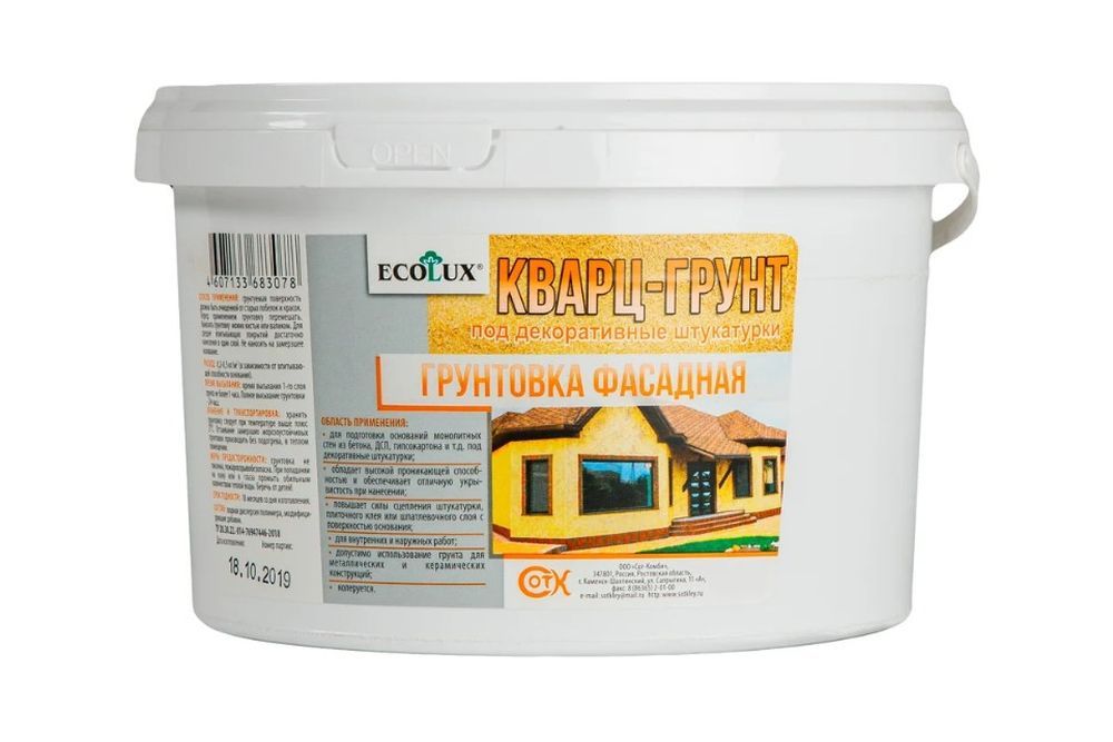 Грунтовка для обработки фасадных поверхностей перед штукатуркой или покраской. Включает кварцевые наполнители, акриловые сополимеры, кварцевый наполнитель и антисептические добавки. Обеспечивает отличную адгезию к фасадным материалам, защищает их от воздействия атмосферных факторов, плесени и грибка. Паропроницаема, влагостойка, укрепляет рыхлые основания.