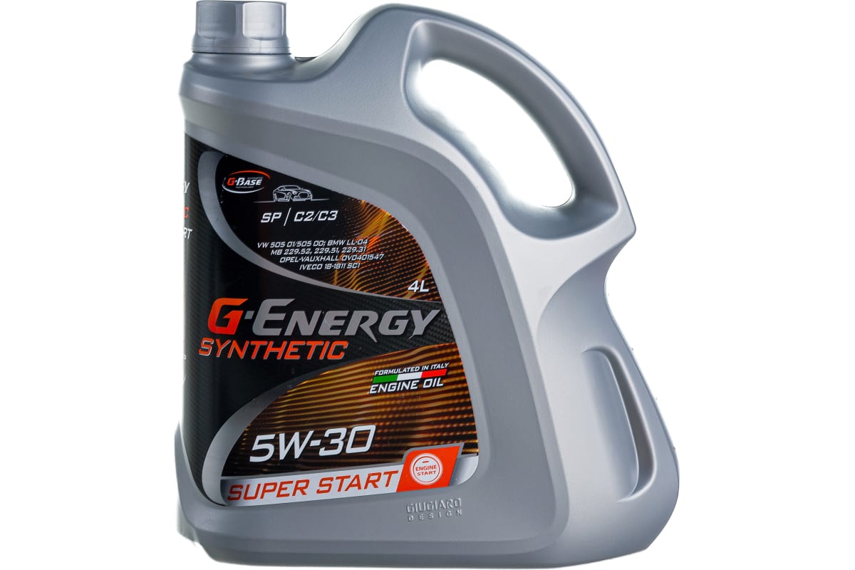 Моторное масло G-Energy Synthetic Super Start 5W-30 на основе базовых компонентов G-Base с улучшенными низкотемпературными свойствами. Применение: для бензиновых и дизельных двигателей (с турбонаддувом и без) легковых автомобилей, легких внедорожников, микроавтобусов и легких грузовых автомобилей, где требуется вязкость 5W-30 и уровень свойств ACEA C2/C3, API SP и ниже; в двигателях автомобилей, оборудованных системами очистки выхлопных газов, включая сажевые фильтры (DPF) и катализаторы (TWC). Преимущества: обеспечивает лёгкий запуск двигателя при использовании в любых климатических зонах; защищает двигатель от низкотемпературных отложений при его прогреве; предотвращает негативные последствия при запуске двигателя; обеспечивает плавность и снижение шума работы двигателя; пониженная зольность. Спецификации: ACEA C2/C3; API SP; VW 505 00/505 01; MB 229.52, 229.51, 229.31; BMW Longlife-04; General Motors Dexos 2; Opel-Vauxhall OV0401547; Iveco 18-1811 SC1.