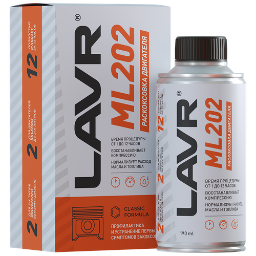 Раскоксовка двигателя ML202 – классическая жидкая формула для раскоксовки цилиндро-поршневой группы. Состав подходит для очистки всех типов бензиновых и дизельных двигателей, у которых впервые или недавно диагностированы симптомы закоксовки. Обладает высокой проникающей способностью и щадящим воздействием: после применения этой раскоксовки двигатель можно эксплуатировать на повышенных оборотах. Эффективно устраняет такие проблемы как средний перерасход масла, снижение мощности, ухудшение динамики и приемистости, повышенный расход топлива, разность компрессии в цилиндрах. Продукт рекомендуется к применению при регулярной эксплуатации в условиях городского трафика. Время воздействия варьируется в зависимости от степени загрязнения двигателя до 12 часов без риска повредить резиновые уплотнители, краску поддона картера и антифрикционные покрытия цилиндров. Раскоксовка двигателя ML202 подходит для применения в бензиновых и дизельных двигателях любого типа.Применяется при первых признаках закоксовкиРаскоксовывает компрессионные и маслосъемные кольцаВосстанавливает компрессию при отклонении от нормы от 15 – 20%Рекомендовано при расходе масла до 100 мл на 1000 км пробега на атмосферных двигателях и до 500 мл на 1000 км пробега на турбированных двигателяхСнижает расход масла и топливаВремя воздействия от 1 до 12 часовВыпускаемая упаковка рассчитаны на двигатели объемом до 2,0 LНе требует снятия поддона картераПроведение процедуры производится с обязательной заменой маслаВ комплект входит подробная инструкция по применению раскоксовки, удлинительная трубочка и шприц