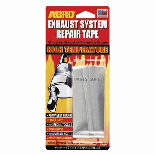 алюминиевая лента с высокотемпературной клеящей основой.Сфера применения: предназначен для ремонта и герметизации выхлопной системы, в том числе глушителя, расширительных баков.Свойства: • предотвращает выделение вредных газов из негерметичных выхлопных систем; • уменьшает шум и устраняет прорыв выхлопных газов; • выдерживает температуры до 400˚С; • удобен, прост и экономичен в использовании; • не воспламеняется и не растворяется в воде; • не содержит асбест; • размер: 5 см × 101,6 см.Тщательно зачистите обрабатываемые поверхности наждачной бумагой или металлической щеткой.Убедитесь, что ремонтируемые детали выхлопной системы не горячие.Отделите бандаж от защитного слоя.Обмотайте ремонтируемую область лентой с натягом.Натягивая ленту, обмотайте ремонтируемую область внахлест с перекрытием предыдущего слоя на 1,25 см.Для достижения лучших результатов предварительно воспользуйтесь Цементом глушителя ABRO® (ES-332)