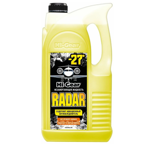 Незамерзающая стеклоомывающая жидкость Hi-Gear RADAR -27 °С разработана с использованием компонентов, применяемых в авиационных антиобледенительных жидкостях, предназначенных для очистки в полете стекол кабин, винтов вертолетов, крыльев самолетов от наледи. Входящий в состав антиобледенитель препятствует образованию на лобовом стекле ледяной пленки и обмерзанию щеток при использовании стеклоомывателя на больших скоростях. Hi-Gear RADAR -27 °С при низких температурах отличается повышенной текучестью (сниженной вязкостью), что улучшает распыливание и увеличивает дальнобойность струи до 3 раз по сравнению с обычной жидкостью на основе изопропилового спирта. Это существенно повышает эффективность очистки и улучшает обзор. Hi-Gear RADAR -27 °С безопасна для резины, пластика, лакокрасочных покрытий, металла и иных материалов автомобиля.
