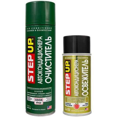 Многие автовладельцы сталкивались с неприятным запахом в автомобиле при включении кондиционера. Появление неприятного запаха может быть связано с накоплением пыли, грязи, а также может быть вызвано размножением бактерий, которые в свою очередь негативно влияют на здоровье человека. Очистители кондиционера автомобиля STEPUP SP5152 и SP5150N помогут Вам эффективно и без разборки очистить систему кондиционирования!Комплексная очистка системы вентиляции – отличное решение для профилактики и устранения неприятных запахов. Благодаря своим свойствам очистители STEPUP проникают глубоко внутрь и очищают от пыли, грязи и различных отложений, которые негативно сказываются на здоровье водителя и пассажиров.Пенный очиститель кондиционера STEPUP используется для профессиональной очистки и дезинфекции испарителей и воздушных каналов автомобильных кондиционеров. С помощью очистителя Вы сможете быстро и без разборки кондиционера устранить неприятные запахи в салоне Вашего автомобиля. Очиститель формирует устойчивую защитную дезинфицирующую пленку, которая надолго предотвращает накопление и размножение микроорганизмов.Шашка для кондиционера STEPUP предназначена для восстановления свежести и обеззараживания воздуха в системе кондиционирования салона автомобиля. Она эффективно очищает и дезодорирует узлы и детали системы кондиционирования, уничтожает накопившиеся в ней вредные вирусы, бактерии и другие микроорганизмы.для применения состава необходимо приобрести шланг-удлинитель SP5154К, который продается отдельно.Преимущества комплекта:Приятная цена;Эффективное средство;Комплект из 2-х средств;Легкость в использовании;Устраняет неприятные запахи;Не требует демонтажа салонного фильтра;Нейтрализует источники неприятных запахов;Восстанавливает свежий и чистый воздух в салоне автомобиля;Пенный очиститель образует защитную антибактериальную пленку на испарителе.! Способ применения необходимо смотреть на упаковке, так как для каждого средства он индивидуален.! Дезинфекционную очистку испарителей автомобильных кондиционеров необходимо производить не реже одного раза в год. Эту процедуру обычно выполняют на станциях техобслуживания, но с очистителем STEP-UP качественная очистка кондиционера под силу каждому автовладельцу.