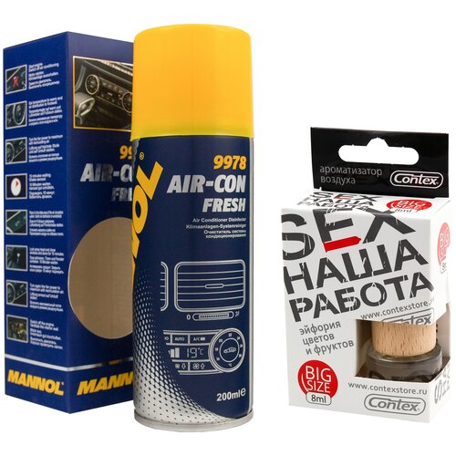Одной из основных причин неприятного запаха в системе кондиционирования являются загрязнения, скапливаемые на его испарителе. Со временем загрязнения накапливаются и автокондиционер требует использования очистителей. Очиститель кондиционера автомобиля MANNOL поможет Вам эффективно и без разборки очистить систему кондиционирования!Очиститель кондиционера авто MANNOL предназначен для дезодорации и профилактики любых типов автомобильных кондиционеров, каналов вентиляции или воздуховодов автомобилей без демонтажа салонного фильтра. Благодаря высокоэффективному составу данный очиститель также предупреждает аллергические заболевания, удаляя вредные микроорганизмы с ячеек системы кондиционирования.Одним из главных преимуществ очистителя автокондиционера является отсутствие необходимости разборки системы кондиционирования. Очиститель очень прост в использовании и не требует применения дополнительных инструментов. После очистки салон автомобиля наполнится свежим и чистым воздухом.С помощью ароматизатора дерево CONTEX SEX наша работа Вы дополните эффект от очистки системы вентиляции и сможете обновить аромат в салоне. Ароматизатор наполнит салон Вашего автомобиля утренним концертом из цветочных и фруктовых запахов с восточными оттенками.Из-за подвесного формата Вы сможете сами выбрать, где расположить данный ароматизатор, он безопасен при использовании на постоянной основе.Преимущества комплекта:Приятная цена;Качественный состав;Ароматизатор создаст приятную атмосферу в салоне автомобиля;После очистки снизится риск появления аллергических заболеваний;Ароматизатор наполнит салон Вашего автомобиля утренним концертом из цветочных и фруктовых запахов с восточными оттенками;Комплект из очистителя кондиционера и ароматизатора вернет Вашему салону свежесть;Благодаря очистителю Вы эффективно и быстро устраните неприятные запахи, бактерии, грибковую плесень и причину их появления в будущем;Легкость в применении: очиститель используется без демонтажа салонного фильтра и разборки системы кондиционирования, а сама процедура очистки не займет много времени.