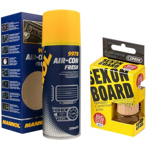 Одной из основных причин неприятного запаха в системе кондиционирования являются загрязнения, скапливаемые на его испарителе. Со временем загрязнения накапливаются и автокондиционер требует использования очистителей. Очиститель кондиционера автомобиля MANNOL поможет Вам эффективно и без разборки очистить систему кондиционирования!Очиститель кондиционера авто MANNOL предназначен для дезодорации и профилактики любых типов автомобильных кондиционеров, каналов вентиляции или воздуховодов автомобилей без демонтажа салонного фильтра. Благодаря высокоэффективному составу данный очиститель также предупреждает аллергические заболевания, удаляя вредные микроорганизмы с ячеек системы кондиционирования.Одним из главных преимуществ очистителя автокондиционера является отсутствие необходимости разборки системы кондиционирования. Очиститель очень прост в использовании и не требует применения дополнительных инструментов. После очистки салон автомобиля наполнится свежим и чистым воздухом.С помощью ароматизатора дерево CONTEX SEX ON BOARD Вы дополните эффект от очистки системы вентиляции и сможете обновить аромат в салоне, наполнив его яркими нотками грейпфрута и нежными лепестками розы.Преимущества комплекта:Приятная цена;Качественный состав;Ароматизатор создаст приятную атмосферу в салоне автомобиля;После очистки снизится риск появления аллергических заболеваний;С помощью ароматизатора Вы наполните салон ароматом грейпфрута и лепестков розы;Комплект из очистителя кондиционера и ароматизатора вернет Вашему салону свежесть;Благодаря очистителю Вы эффективно и быстро устраните неприятные запахи, бактерии, грибковую плесень и причину их появления в будущем;Легкость в применении: очиститель используется без демонтажа салонного фильтра и разборки системы кондиционирования, а сама процедура очистки не займет много времени.