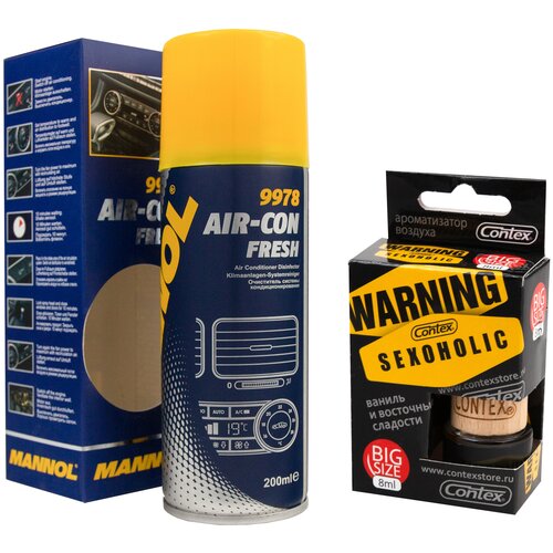 Одной из основных причин неприятного запаха в системе кондиционирования являются загрязнения, скапливаемые на его испарителе. Со временем загрязнения накапливаются и автокондиционер требует использования очистителей. Очиститель кондиционера автомобиля MANNOL поможет Вам эффективно и без разборки очистить систему кондиционирования!Очиститель кондиционера авто MANNOL предназначен для дезодорации и профилактики любых типов автомобильных кондиционеров, каналов вентиляции или воздуховодов автомобилей без демонтажа салонного фильтра. Благодаря высокоэффективному составу данный очиститель также предупреждает аллергические заболевания, удаляя вредные микроорганизмы с ячеек системы кондиционирования.Одним из главных преимуществ очистителя автокондиционера является отсутствие необходимости разборки системы кондиционирования. Очиститель очень прост в использовании и не требует применения дополнительных инструментов. После очистки салон автомобиля наполнится свежим и чистым воздухом.С помощью ароматизатора дерево CONTEX WARNING SEXOHOLIC Вы дополните эффект от очистки системы вентиляции и сможете обновить аромат в салоне, наполнив его легкостью ванили и восточных сладостей.Ароматизатор создаст приятную атмосферу в салоне автомобиля;После очистки снизится риск появления аллергических заболеваний;Комплект из очистителя кондиционера и ароматизатора вернет Вашему салону свежесть;Легкость в применении: очиститель используется без демонтажа салонного фильтра и разборки системы кондиционирования, а сама процедура очистки не займет много времени.Способ применения:1. Закройте все окна автомобиля и заведите двигатель.2. Выключите кондиционер.3. Включите отопление на полную мощность в режиме рециркуляции.4. Тщательно взболтайте содержимое флакона и установите MANNOL Air-Con Fresh в круглое отверстие упаковки по направлению к внутреннему забору воздуха рециркуляции.5. Нажмите на клапан вниз до щелчка.6. Покиньте автомобиль и закройте все двери.7. После обработки хорошо проветрите салон и выключите двигатель.Безопасно используйте дезинфицирующие средства. Всегда читайте этикетку и информацию о продукте перед использованием.