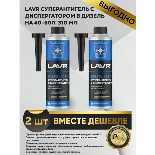 Суперантигель с диспергатором в дизельное топливо Lavr на 40-60л, -45C, 310 мл Ln2106 предотвращает выпадение парафинового осадка в баке для топлива, исключает забивание фильтра, обеспечивает холодный запуск двигателя при температуре -45 С. Входящие в состав компоненты снижают предельную температуру фильтруемости и застывания дизеля. Продукт обладает смазывающими свойствами и защищает внутренние детали от коррозии. Антигель связывает молекулы воды и препятствует образованию пробки из льда.