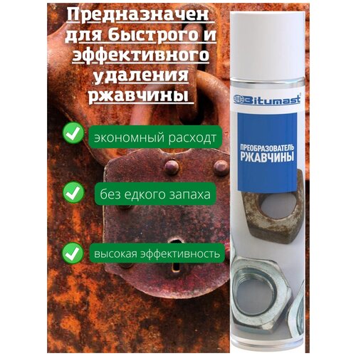 Преобразователь ржавчины аэрозольный высокоэффективный продукт, состоящий из функциональных добавок, алифатического углеводорода, смеси газов. Средство от ржавчины предназначено для удаления коррозии и подготовки металлической поверхности под дальнейшую обработку лакокрасочным покрытием . Нейтрализатор ржавчины преобразует ржавчину в стабильное химическое соединение, придающее покрытию дополнительную адгезию при нанесение лакокрасочных материалов. Нейтрализатор ржавчины для авто удобен для применения в труднодоступных местах и на неровных поверхностях.