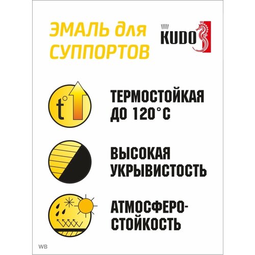 Высококачественная алкидная эмаль для суппортов KUDO . Эмаль аэрозольная автомобильная краска в баллончике KUDO предназначена для тюнинга и окраски суппортов и тормозных барабанов автомобилей и мотоциклов. Краска для суппортов KUDO содержит компоненты, повышающие устойчивость лакокрасочного покрытия к абразивному воздействию песка, летящих камней и коррозионному влиянию воды и растворов дорожных реагентов. Автомобильная эмаль аэрозольная краска эмаль для тюнинга суппортов обладает прекрасным блеском, превосходной адгезией к окрашиваемой поверхности, хорошей укрывистостью, атмосферостойкостью и термостойкостью до +120°С. Автоэмаль можно наносить на металл, предварительного грунтования не требуется. Для достижения наилучших результатов эмаль для автомобиля наносить при температуре окружающей среды не ниже +10°С. Аэрозольная краска легко наносится на труднодоступные места. Перед использованием баллон энергично встряхивать в течение 2–3-х минут. Краска спрей наносится на чистую, сухую и обезжиренную поверхность. Аэрозольная эмаль наносится с расстояния 25–30 см, избегая перелива, в 2–3 слоя с промежуточной сушкой 10–15 минут при температуре +20°С. Время сушки «на отлип» при температуре +20°С — 50–60 минут. Время полного высыхания при температуре +20°С — 24 часа. Внимание! По окончании работы во избежание засорения головки распылителя рекомендуется перевернуть баллон вверх дном и распылять до тех пор, пока не перестанет поступать эмаль. Важно! Наносить последующие слои ЛКМ необходимо либо не позднее, чем через 2 часа, либо не ранее, чем через 2 недели. Не требует дополнительного покрытия лаком.