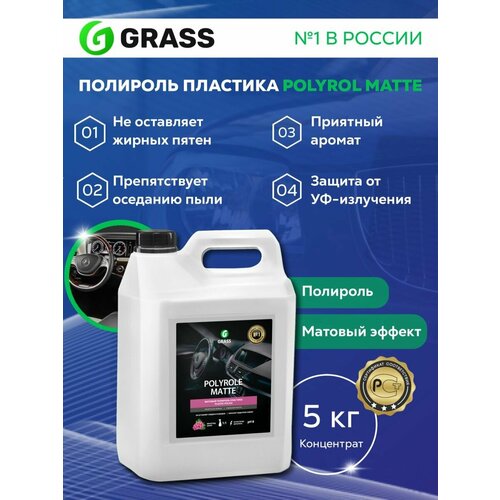 Профессиональный матовый полироль Grass "Polyrole Matte" для обработки приборных панелей, неокрашенных бамперов, покрышек, для очистки и полировки изделий из кожи, дерева винила, пластика и резины, не оставляет жирных пятен, препятствует оседанию пыли придает матовый блеск, обладает приятным ароматом.
