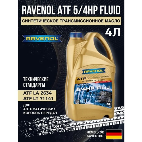 RAVENOL ATF 5/4 HP Fluid – это полностью синтетическое трансмиссионное масло для АКПП, разработанное в Германии на основе полиальфаолефинов ПАО с добавлением специального комплекса присадок и ингибиторов, которые обеспечивают бесперебойную работу автоматической коробки передач. По своим характеристикам превосходит аналоги других производителей, в том числе и аналог Mobil (Esso) LT 71141. Это жидкость для современных 4-х и 5-ти ступенчатых автоматических коробок переключения передач (ATF) концерна ZF. Гарантирует бесперебойную работу АКПП при максимальных нагрузках и обеспечивает защиту от износа. Жидкость применяется для АКПП производства ZF серия 4 HP (4HP20, 4HP22, 4HP24) и 5HP (5HP18, 5HP19, 5HP24, 5HP30). Не требует доливки/замены при нормальных условиях эксплуатации. Жидкость является сервисным продуктом, требующим профессионального подхода к выбору. Его применение зависит от типа коробки передач, а не от марки автомобиля. Соблюдайте рекомендации производителя АКПП в плане подбора жидкости, порядка и периодичности её смены. Применение RAVENOL ATF 5/4HP Fluid обеспечиваетОчень хорошие смазывающие свойства даже при низких температурах в зимний периодСтабильно высокий индекс вязкостиВысокую устойчивость к окислениюКомплексную защиту от износа, коррозии и пенообразованияВысокую стабильность тренияВысокую термическую и окислительную стабильностьПрекрасные охлаждающие свойства