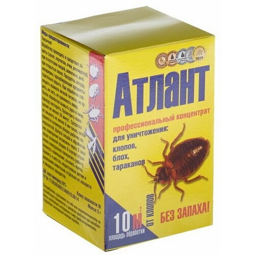 Средство представляет собой мелкодисперсный порошок голубого или белого цвета, который необходимо растворить в воде. Не оставляет следов на поверхности и образует стойкую невидимую плёнку. После контакта с ней насекомые гибнут в течение нескольких минут.Благодаря активному действующему веществу «Атлант» справляется с клопами, которые устойчивы к большинству средств. Содержимое упаковки рассчитано на приготовление 1 литра раствора для обработки до 10 м².Действующее вещество: ацетамиприд (20 %).Назначение: для гарантированного уничтожения клопов, тараканов, блох, крысиных клещей.