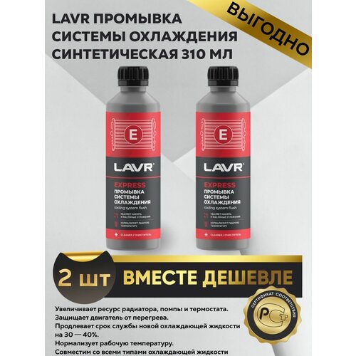 Промывка системы охлаждения экспресс LAVR Express 310мл - двухфазный состав для добавления в антифриз перед его заменой. Растворяет и выводит накипь и ржавчину, продукты разложения охлаждающей жидкости и следы масла, образующиеся в процессе эксплуатации в жидкостных и комбинированных системах охлаждения. Нормализует рабочую температуру. Защищает двигатель от перегрева. Увеличивает ресурс радиатора, помпы и термостата. Продлевает срок службы новой охлаждающей жидкости на 30 ─ 40%. Совместим со всеми типами охлаждающей жидкости. Рекомендуется проводить промывку системы охлаждения при каждой смене антифриза Во избежание выброса антифриза и промывочного раствора слив жидкостей из системы производить при температуре двигателя не выше +80°C! Закипающая жидкость приведет к мгновенному выбросу наружу токсичного химиката, что, кроме непременных ожогов, приведет к попаданию в организм ядовитых паров. Перед применением прогреть состав до комнатной температуры и встряхнуть. Накрыть тряпкой крышку радиатора или расширительного бачка и медленно ее открыть, сбрасывая давление системы. Только после этого можно открывать ее полностью. Залить состав в радиатор или расширительный бачок (в случае полностью закрытого радиатора) из расчета 310 мл очистителя на 10 л охлаждающей жидкости. Запустить и прогреть двигатель до рабочей температуры (+80 ─ 90°С). Дать ему поработать 30 минут на холостом ходу. Все это время отопитель салона должен быть включен на максимальном обогреве. Заглушить и остудить двигатель. Слить промывочный раствор. Под радиатором поставить емкость для сбора старой охлаждающей жидкости и промывочного раствора. Вывернув сливные пробки, слить антифриз по очереди из двигателя и радиатора. Промыть систему охлаждения до полного вымывания остатков промывочной жидкости: залить дистиллированную или чистую теплую воду, прогреть двигатель (дождитесь открытие термостата, при котором подводящий и отводящий патрубки от радиатора будут горячими) и дать ему поработать 10 ─ 15 минут на холостом ходу, слить воду. При необходимости повторить процедуру. Установить сливные пробки и залить в систему новую охлаждающую жидкость. Промывка системы охлаждения двигателя; очиститель системы охлаждения; очиститель радиатора; Восстановление; очистка; промывка; для авто; автомобиля; машины.