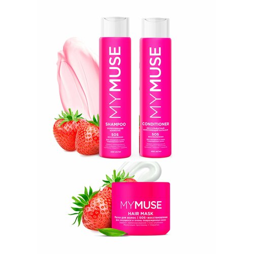 MY MUSE Укрепляющий шампунь, бальзам и маска SOS восстановление. Для секущихся и поврежденных волос с эффектом ламинирования с соком клубники и молочными протеинами, кератином и керамидом Кератин увлажняет и питает, улучшает структуру волос Керамид - это блеск, защита от ломкости, защита и улучшение структуры волос. Молочные протеины эффективно питают волосы, а также способствуют их росту и регенерации. Сок клубники увлажняет волосы, придает блеск и восстанавливает волосы.