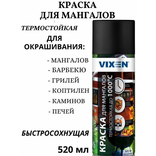 Эмали и краски повышенной термостойкости VIXEN для окрашивания мангалов, барбекю, грилей, коптилен, каминов, печей и других металлических изделий, эксплуатирующихся при температуре до 1000°C. Краска в баллончике чернаяТермостойкая краска содержит антикоррозийные добавки, за счет чего образует стойкое к коррозии покрытие, обладающее превосходной атмосферостойкостью и сцеплением с окрашиваемой поверхностью.Краска термостойкая для металла экономична при нанесении, так как обладает повышенной укрывистостью. Не требует предварительного грунтования и не стекает при равномерном нанесении. Эмаль легко наносится на труднодоступные места и изделия со сложной геометрией поверхности.Может использоваться для внешних и внутренних работ, как краска автомобильная в баллончиках, как краска термостойкая, покрытие не токсично после высыхания.Инструкция по использованию:Перед окрашиванием охладите поверхность до температуры не более +25°С, зачистите от ржавчины, просушите и обезжирьте. Защитите поверхности, не подлежащие окрашиванию, пленкой или бумагой во избежание попадания на них краски. Энергично встряхните баллон в течение 2-3 мин. Для получения качественного покрытия работы производить при температуре окружающей среды от +15 до +25°С.Нанесите краску с расстояния 15-20 см в 2-3 слоя с промежуточной сушкой 10-15 мин. При окрашивании больших по площади поверхностей в промежутках между нанесением встряхивайте баллон. Время высыхания «на отлип» при температуре +20°С составляет не менее 15 мин. Полное время высыхания при температуре + 20°С – не менее 24 часов. Полное отверждение покрытия происходит при нагреве во время эксплуатации изделия.Внимание! Не наносить краску на горячую поверхность!Во избежание засорения головки распылителя по окончании работ рекомендуется продуть сопло, перевернув баллон вверх дном.