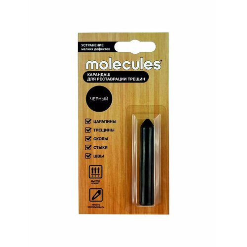 Карандаш для реставрации трещин Molecules чёрного цвета предназначен для быстрой маскировки небольших повреждений, царапин, стыков, сколов на деревянной мебели, предметах декора, ламинате, паркетной доске, пластике, поверхностях из ДСП, МДФ и фанеры.Твердый воск можно использовать как в жилых помещениях, так и на террасах и в местах с повышенной влажностью. Подходит для восстановления оконных рам внутри дома, хорошо сцепляется с поверхностью, не смывается, не окисляется, долго сохраняет защитные свойства.Преимущества воскового карандаша:отталкивает влагу;визуально обновляет деревянные поверхности;сохраняет рельеф древесины;излишки легко удаляются спиртом.Длина карандаша — 64 мм. Страна производства — Россия.