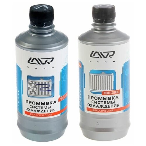 Классическая промывка системы охлаждения LAVR рекомендуется для всех типов систем охлаждения двигателей грузовых и легковых автомобилей. Применяется перед заменой антифриза или использованием герметика системы охлаждения LAVR StopLeak. Её особенности: Нормализует работу системы охлаждения и защищает двигатель от перегрева. Эффективно и безопасно удаляет накипь, продукты разложения антифриза, ржавчину и другие загрязнения. Увеличивает ресурс радиатора, помпы и термостата. Применение: Во избежание выброса горячего антифриза слив охлаждающей жидкости осуществлять при температуре двигателя не выше 80 °C! Слить антифриз из системы охлаждения и отопителя. Залить препарат в систему охлаждения и долить тёплой воды до отметки MIN. Прогреть двигатель и промыть систему в течение 30 минут при движении автомобиля или на холостом ходу. Рекомендуется ограничить нагрузку на двигатель. Слить промывочный раствор. Для удаления остатков загрязнений дважды промыть систему чистой водой. Для этого залить воду в систему охлаждения, прогреть двигатель и дать ему поработать 10 — 15 минут на холостом ходу или при движении автомобиля, после чего слить воду. Залить свежий антифриз. Упаковка препарата рассчитана на 8 — 10 л объёма антифриза. Для наилучшей очистки рекомендуется использовать дистиллированную воду LAVR.