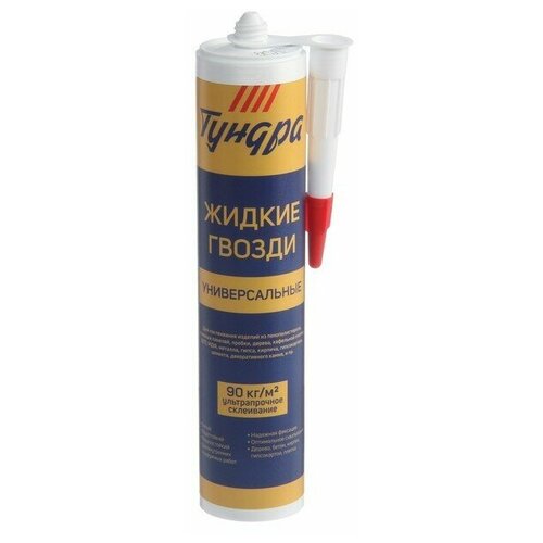 Жидкие гвозди универсальные марки тундра предназначены для наклеивания изделий из пенополистирола, стеновых панелей, пробки, дерева, кафельной плитки, ДСП, МДФ, металла, гипса, кирпича, гипсокартона, цемента, декоративного камня, и пр. Преимущества жидких гвоздей тундра подходят для большинства известных материалов; клеевой шов имеет высокую эластичность; для наружных и внутренних работ; водо- и морозостойкий; высокая прочность приклеивания; сила схватывания – 90 кг/м²; экологически чистый; универсальное применение направленного действия; возможна окраска водно-дисперсионной краской; обработка наждачной бумагой после высыхания для белого цвета. Указания по применению приклеивать к сухим и обезжиренным выровненным пористым поверхностям, предварительно очищенным от пыли и загрязнений; клей наносится либо сплошной полосой, либо точечно; время открытого позиционирования до 1-2 минут; склеиваемые поверхности прижать друг к другу; продолжительность высыхания 20-30 минут; полное схватывание клеящего вещества при температуре 20 °С достигается через 48 часов; при приклеивании декоративных тяжелых панелей использовать фиксирующие приспособления на время схватывания – до 4 часов и более; при наклеивании потолочной плитки, панелей и др. следует выполнять инструкции производителей вышеуказанных декоративных элементов; по окончании работ излишки клея удалить ацетоном, денатуратом или уайт-спиритом.