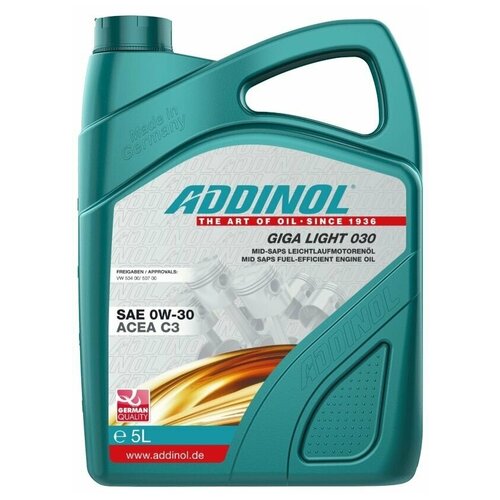 ADDINOL Giga Light 030 Это экономичное высокоэффективное моторное масло класса SAE 0W-30.Идеальное сочетание синтетических технологий и инновационных добавок обеспечивает выдающиеся эксплуатационные характеристики со средним уровнем SAPS, а также характеристики Longlife III.применение• Универсальное средство, идеально подходящее для самых современных и мощных легковых автомобилей и транспортных средств с бензиновыми и дизельными двигателями• Как моторное масло Mid SAPS, идеально подходящее для современных дизельных двигателей с сажевыми фильтрами или без них• Превосходная пригодность для двигателей, работающих на природном (CNG) и сжиженном нефтяном газе (LPG)• Также рекомендуется для автомобилей, требующих моторного масла с ACEA C2характеристики• Отличная моющая способность• Чрезвычайно низкое трение• Очень низкие потери при испарении• Превосходная защита от износа• Оптимальная вязкость для любых условий вождения• Отличные характеристики в условиях низких температур• Характер среднего давления• Очень хорошая совместимость с эластомерамипреимущества И преимущества• Превосходная чистота двигателя, оптимальная производительность двигателя• Низкий расход топлива• Низкий расход масла• Длительный срок службы двигателя• Устойчивая смазочная пленка при любых условиях эксплуатации• Отличные характеристики при холодном запуске и прогреве• Повышение эффективности сажевого фильтра дизельного топлива (DPF)• Длительный срок службы после очистки выхлопных газов, отличные экологические характеристики благодаря низким выбросам• Улучшенная защита от протечекСпецификации и допуски: W 504 00, VW 507 00Выполняет требования: BMW Longlife-04, MB 229.51, MB 229.31, MB 229.52