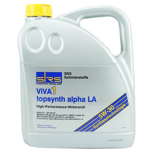 SRS ViVA 1 topsynth alpha LA – это высокоэффективное синтетическое моторное масло лёгкой текучести вязкости SAE 5W 30. Синтетическая основа и инновационные присадки низкосульфатной зольности (low sulphated ash), позволяют быть уверенным в соответствии SRS ViVA 1 topsynth alpha LA требованиям двигателей современных автомобилей.Отличные показатели при холодном старте подтверждают оптимальную смазывающую способность при низких температурах.SRS ViVA 1 topsynth alpha LA выдерживает предельные нагрузки и высокие температуры при любых условиях эксплуатации.