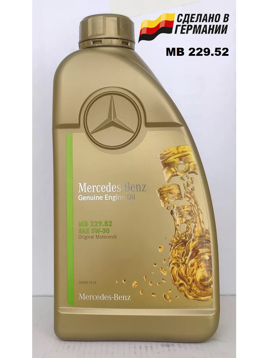 Оригинальное масло, произведено в Германии, номер партии указан в трех местах: 1.на коробке 2. на канистре сзади. 3. напечатан на крышке в месте где она соприкасается с контрольным кольцом и нарушается при вскрытии (что предотвращает использование канистры вторично). QR код направляет на сайт Daimler GMS а не на другие. Mercedes-Benz разработал моторное масло стандарта MB 229.52 для самых сложных тепловых режимов и совместимостью с системами доочистки отработавших газов. Стандарт MB 229.52 применяется для всех автомобилей Mercedes, оснащенных дизельными двигателями BlueTEC с селективно-восстановительной системой (SCR), позволяющей удалить оксиды азота (NOx), используя добавку AdBlue .Стандарт MB 229.52 полностью обратно совместим с требованиями MB 229.51 и MB 229.31, для всех дизельных двигателей Mercedes, оснащенных сажевым фильтром (DPF) и некоторых бензиновых двигателей. Эксклюзивная технология сниженного содержания сульфатной золы, фосфора и серы защищает и увеличивает долговечность систем доочистки отработавших газов, таких как селективно восстановительная система (SCR) и сажевый фильтр (DPF). 100% синтетическая база обеспечивает высокую терм окислительную стабильность и устойчивость к высоким температурам. Предотвращает образование лаков и шламов. Обеспечивает чистоту двигателя. Уменьшает вероятность за коксования поршневых колец. Обеспечивает максимальную защиту и смазывающие свойства в самых сложных условиях. Низкая испаряемость снижает потребление масла на угар. Превосходная термо-окислительная стабильность позволяет увеличить межсменные интервалы в соответствии с требованиями производителя техники. Производство: Германия