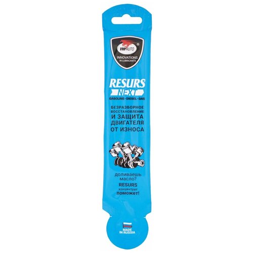 Самая компактная в мире добавка в двигательRESURS Next – новое поколение реметаллизанта RESURS для безразборного восстановления бензиновых и дизельных двигателей. Частицы нового продукта настолько малы и активны, что практически не оседают в поддоне, восстанавливая детали двигателя непрерывно. Продукт не требует встряхивания. Решает проблемы: угара масла, перерасхода топлива, неровной компрессии, вибрации и шума, дымления, недостаточной мощности двигателя.Активный компонент – нано порошок сплава меди, олова и серебра попадает в зону трения, создавая на поверхности узлов плакирующий слой. Он способен выровнять все микродефекты и улучшить работу деталей цилиндропоршневой группы и подшипников коленчатого вала.Под действием температуры и давления частицы активизируются и начинают восстанавливать поверхность, реагируя в первую очередь на повреждения металла. В отличие от препаратов предыдущих поколений “RESURS” формирует пористую структуру, которая как губка удерживает масло и сохраняет его в зоне трения, надежно защищая детали от износа при холодном пуске, перегреве двигателя, резких ускорениях и торможениях.Применение:Желательно сменить масло и фильтр;Прогреть двигатель до рабочей температуры и заглушить;Залить содержимое флакона в маслозаливную горловину;Дать двигателю поработать на холостых оборотах 10-15 мин.Для восстановления поверхностей двигателя достаточного одного флакона RESURS Next. В случае очень серьезных проблем с двигателем эффект от RESURS не гарантируется.