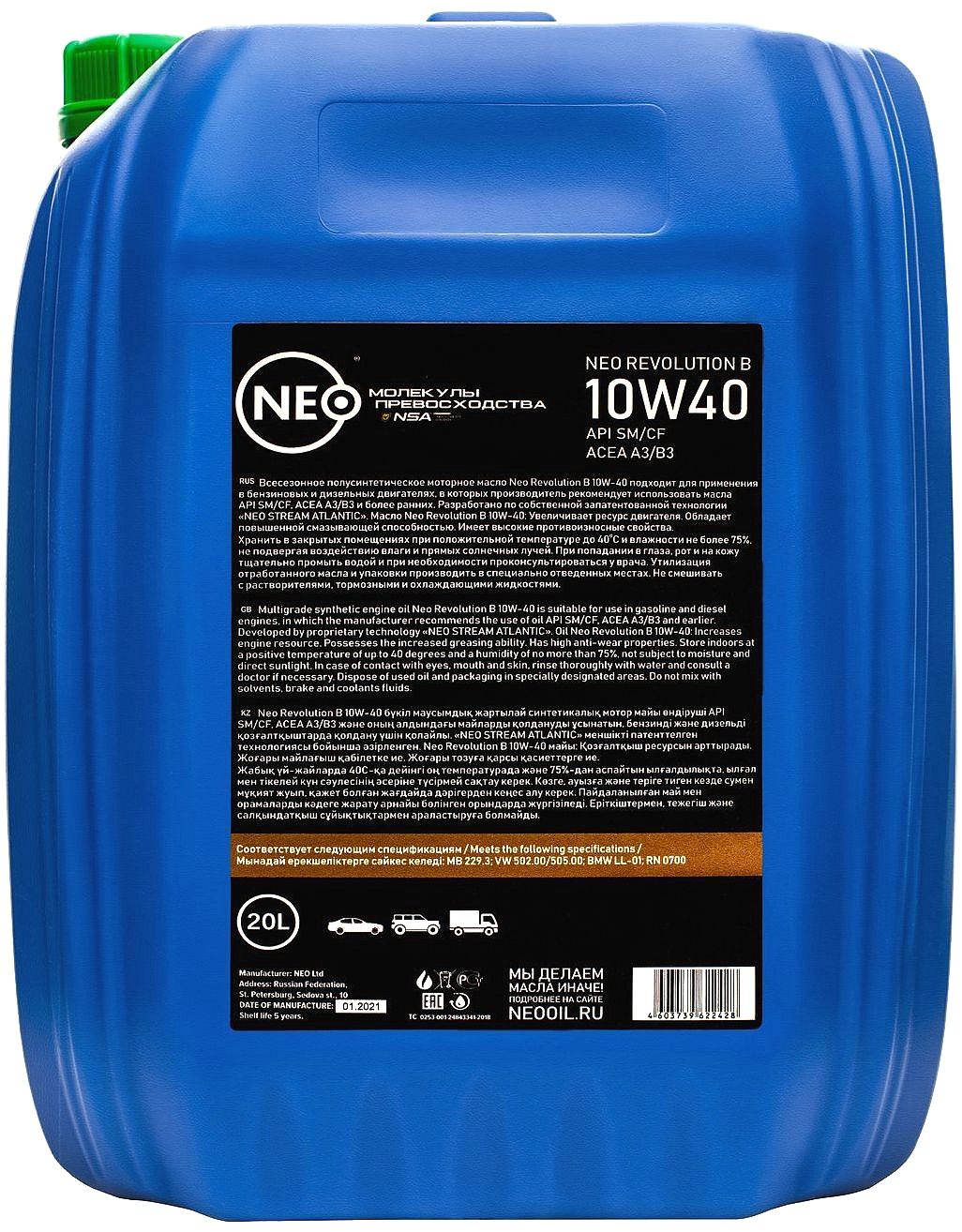 Универсальное полусинтетическое моторное масло (Full SAPS) предназначено для мощных современных бензиновых и дизельных многоклапанных двигателей (в том числе с непосредственным впрыском) легковых автомобилей, легких коммерческих автомобилей и грузовиков, с катализаторами и без, с турбонаддувом и без.Разработанное по собственной запатентованной технологии «NEO STREAM ATLANTIC», моторное масло Neo Revolution B 10W-40 обладает рядом исключительных свойств:• Увеличивает ресурс двигателя;• Обладает повышенной смазывающей способностью;• Имеет высокие моющие свойства;• Имеет высочайшие противоизносные свойства;• Имеет беспрецедентно высокую стойкость масляной пленки;• Обеспечивает высочайшие скоростные и мощностные характеристики двигателя.Неужели это самое БЕЗОПАСНОЕ масло на рынке России?Масло NEO - это Ваш лучший выбор, потому что:1. Максимально охлаждает двигатель, обеспечивая приятную прохладу Вашему силовому агрегату даже в моменты максимальных нагрузок.2. Идеально очищает двигатель, бережно собирая в себе все отложения, которые образуются при ежедневной езде на авто. 3. Безупречный контроль качества. Другими словами NEO наиболее безопасное масло для двигателя, поскольку его невозможно подделать, так как купить его можно только в авторизованных точках продаж от завода.