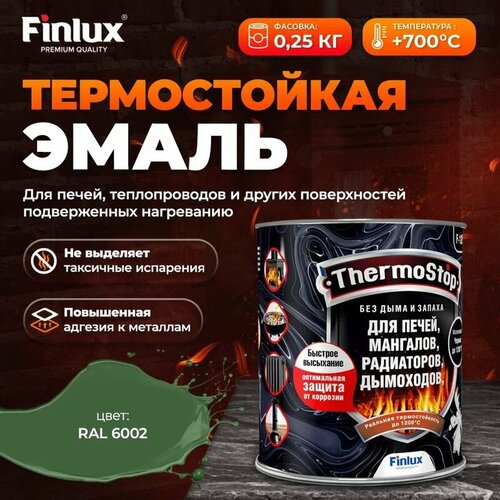Грунт-Эмаль Finlux F-1200 до +1200C Антикоррозионная, для печей мангалов дымоходов радиаторов, Гладкая Быстросохнущая, Матовое покрытие, Ral 6002, 0.25 кг. 700 С