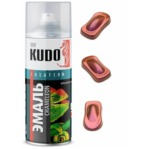 Краска "CHAMELEON", декоративная, цвет "Осеннее танго" (золотой-медный-сиреневый), KUDO 520 мл. Эмаль CHAMELEON предназначена для получения уникального декоративного покрытия с эффектом преломления света. Благодаря интерференционным пигментам покрытие меняет свой цвет в зависимости от угла падения света на окрашенную поверхность. Хамелеон эффектно выглядит на любых деталях и максимально проявляется на поверхностях с плавными изгибами. Для наружных и внутренних работ, наносится на все виды поверхностей. внимание! Эмаль CHAMELEON полупрозрачна после высыхания, первоначальный цвет окрашиваемого изделия влияет на финальный цвет покрытия. Предварительное окрашивание изделия цветной акриловой эмалью или грунтом позволяет получать уникальные по цвету результаты. Эффект Хамелеон также зависит от светлоты основы: чем темнее основа, тем сильнее проявляется эффект.