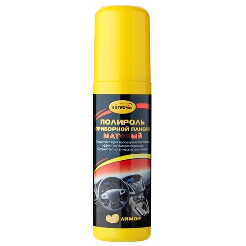 Чистый, ухоженный салон создает более комфортную атмосферу в автомобиле и радует глаз. В особом уходе нуждаются пластиковые детали, которые со временем могут утратить былой эстетичный вид. Это относится к пластиковым элементам любого автомобиля, будь это салон недорогого отечественного автомобиля, либо салон дорогой премиальной «иномарки».Регулярная полировка способна не только сохранить первоначальный вид пластика надолго, но и защитить от факторов, влияющих на его старение, таких, как перепады температур и ультрафиолетовое излучение.Особенности полироли приборной панели ASTROhim.Эффективно очищает и полирует элементы интерьера автомобиля из пластика, винила, резины и кожзаменителя.Придает эффектный глянцевый блеск.Образует на поверхности тонкую полимерную пленку, которая защищает от разрушительного действия ультрафиолетового излучения, предотвращает выгорание и растрескивание пластика.Восстанавливает цвет пластиковой отделки.Предотвращает притягивание пыли к приборной панели, так как содержит антистатические компоненты.Не оставляет жирной и липкой пленки.Обладает приятным ароматом.Не содержит спирт, поэтому безопасен для всех видов пластика.