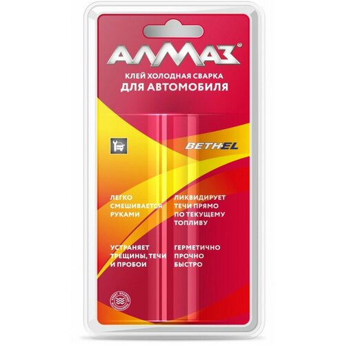 Холодная сварка для ремонта автомобилей Алмаз AZ-0125, 58 г, блистер 54895 быстро, прочно и герметично склеивает различные детали из черных и цветных металлов, стекла и пластика. Состав обеспечивает ремонт выхлопной системы и механических узлов в труднодоступных местах.Продут предназначен для герметизации соединений, затирки сколов и трещин в блоке цилиндров, картере двигателя, устранения течи в радиаторе и бензобаке. Клей можно использовать в условиях повышенной влажности для монтажа замасленных поверхностей.