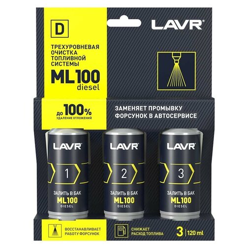 Трехуровневая очистка топливной системы LAVR ML100 Diesel, 120 мл Ln2138 – это трехкомпонентная присадка для последовательного добавления в топливный бак. Состав №1 удаляет рыхлые загрязнения и нагары на клапанах и форсунках. Состав №2 с запатентованными компонентами LAVR DSP / DET™ выводит лаковые и смолистые отложения из топливной системы. Состав №3 смазывает, защищает от коррозии и появления новых загрязнений. Применяется для всех типов систем впрыска дизельных двигателей. Удаляет высокотемпературные форсунок Очищает топливную магистраль Нормализует расход топлива Стабилизирует холодный запуск Содержит пакет моющих присадок LAVR DSP / DET™ Безопасен для сажевого фильтра и катализатора Не засоряет форсунки и фильтры Каждая присадка рассчитана на 30 – 40 литров дизтоплива Рекомендован к применению каждые 20 – 30 тысяч км пробега Применяется при температуре окружающей среды от -5° до +30°C