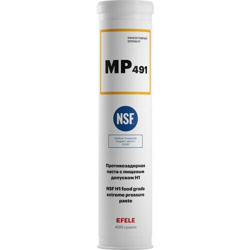 Противозадирная смазка с пищевым допуском EFELE MP-491 - Белая универсальная паста с пищевым допуском NSF H1 на основе минерального масла и композиции светлых твердых смазочных материалов. Обладает исключительной термостойкостью, высокой несущей способностью и противозадирными свойствами. Применяется в узлах трения: направляющие скольжения, резьбовые соединения, шлицевые и шпоночные соединения, сопряжения с посадками с натягом. Диапазон рабочих температур: -40 °C.+1400 °CТермостойкостьМорозостойкостьВысокая несущая способностьОбладает свойствами антиаварийной смазкиОбеспечивает постоянство момента затяжки резьбовых соединенийЗащищает от фреттинг-коррозииПредотвращает скачкообразное движениеЗащищает резьбовые соединения из нержавеющей стали от схватыванияРаботоспособность во влажной средеУстойчивость к смыванию водойОблегчает монтаж и демонтажНе содержит свинец, никель, серу, хлор и фторДлительный срок службы