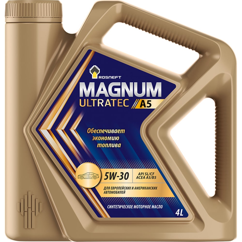 Rosneft Magnum Ultratec A5Rosneft Magnum Ultratec А5 5W-30 – всесезонное полностью синтетическое энергосберегающее моторное масло нового поколения для самых современных двигателей, обеспечивающее экономию топлива за счет низкого значения вязкости при высокой температуре и высокой скорости сдвига (HTHSV - High Temperature High Shear Viscosity). Отличается низкой испаряемостью и сокращает расход топлива.Область примененияМоторное масло Rosneft Magnum Ultratec А5 5W-30 предназначено для применения в современных бензиновых и дизельных двигателях легковых автомобилей и лёгкой коммерческой техники, в том числе оборудованных турбонаддувом, где необходимо применение масел, соответствующих требованиям API SL/CF, ACEA A5/B5 или одной из указанных ОЕМ-спецификаций.Преимущества маслаОбеспечивает надежную защиту деталей двигателя от износа и легкий запуск при низких температурахСоответствует требованиям ведущих мировых автопроизводителей и международных спецификацийОбеспечивает экономию топлива