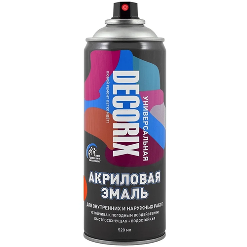 Высококачественная универсальная акриловая краска DECORIX используется в декоративно-оформительских работах, строительстве и ремонте. Предназначена для окрашивания: древесины, пластика, металла, бетона, кирпича, керамики, стекла, картона, минеральных поверхностей. Аэрозольная краска удобна для окрашивания небольших поверхностей и труднодоступных мест. Образует гладкое, устойчивое к выцветанию покрытие.
