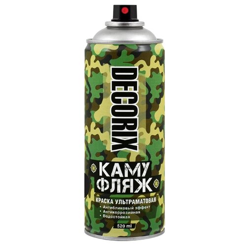 Высококачественная ультраматовая краска DECORIX® камуфляжная предназначена для маскировочного окрашивания военно-спортивного, рыболовно-охотничьего и экспедиционного снаряжений, укрытий и вышек, лодок, вездеходов, квадроциклов, внедорожников и другой техники. Образует ультраматовую поверхность со светопоглощающим эффектом, идеально подходящую для камуфляжа. При правильно подобранных сочетаниях и площади закрашивания цветов краска максимально маскирует объекты на местности. Для создания камуфляжа используйте листья и ветки в качестве трафарета. Аэрозольная краска удобна для локального окрашивания и окрашивания труднодоступных мест.Идеально подходит для окрашивания охотничьего, рыболовного и военного снаряжения, лодок, грузовиков, вездеходов, оборудования для экспедиций. Не отражает свет, создавая эффект скрытности, матовая.Серия «камуфляж» представлена комплектом из четырёх баллончиков спрей-краски различных цветов, объемом по 520 мл каждый.