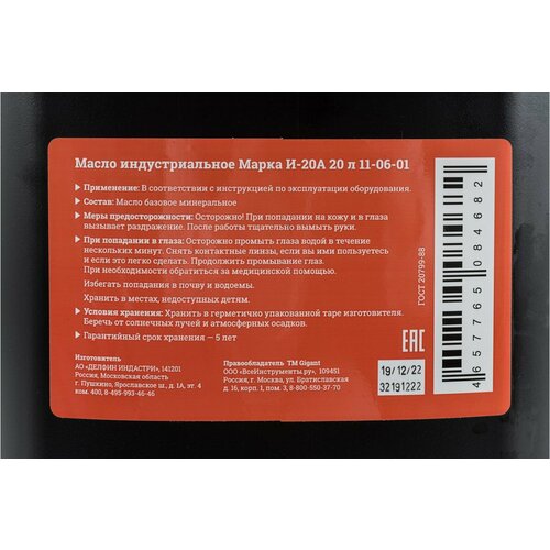 Gigant масло индустриальное марки И-20А 20л. 11-06-01