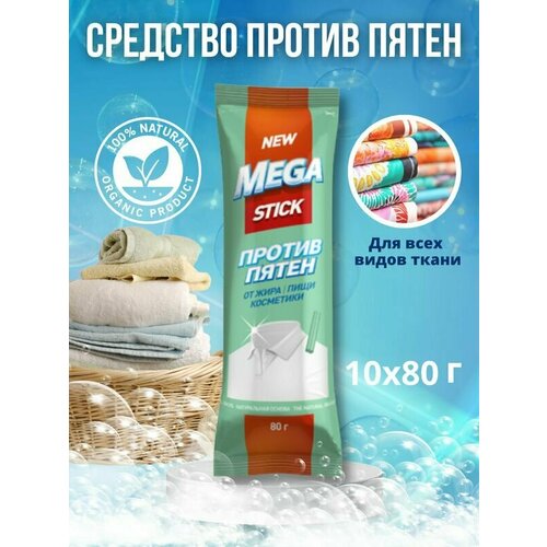 Средство против пятен "MEGA stick". Удаляет следы от вина, фруктов, сока, зелени, чернил и других загрязнений. Стик пятновыводитель 80 гр * 10