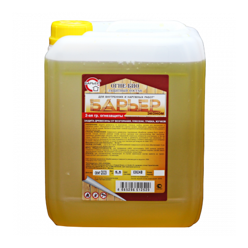 Огнебиозащитный состав Барьер-Эконом предназначен для уменьшения горючести древесины, а также для ее защиты от поражения грибами, водорослями и жуками-древоточцами.Раствор обеспечивает 2-ю (типовую) группу огнезащитной эффективности. После обработки древесина сохраняет биозащитные свойства до 30 лет (согласно ГОСТ 20022.6-93). Продукт тонирует древесину в золотисто-желтый оттенок «сосна».Используется для внутренних и наружных (под навесом) условий эксплуатации. Подходит для обработки стропил, перекрытий, обрешетки кровли и прочих несущих деревянных конструкций.