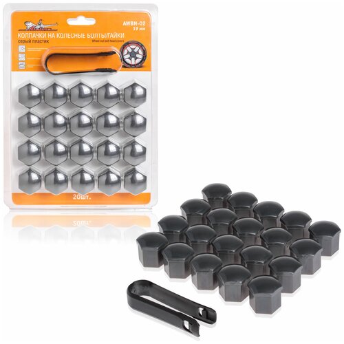 Товарное предложение: Колпачки на колесные болты/гайки 19 мм, 20 шт.+ съёмник, пластик, серые AIRLINE
