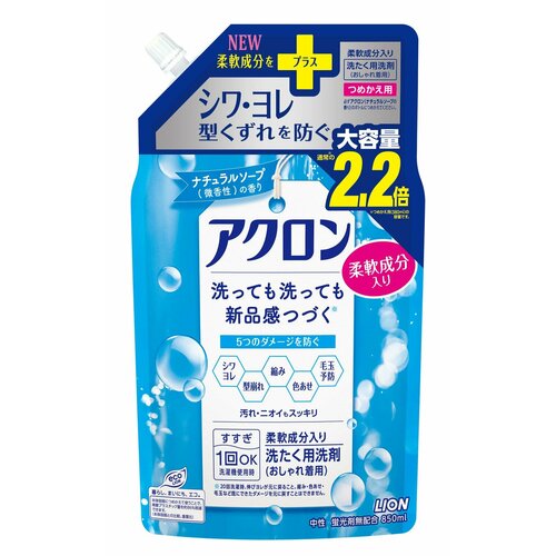 LION Жидкое средство для стирки "Akron" деликатных тканей с лёгким ароматом Нежное мыло 850 мл, мягкая упаковка с крышкой