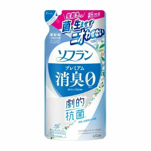 LION Кондиционер для белья "SOFLAN" (с мощным антибактериальным эффектом для защиты от неприятного запаха "Premium Deodorizer 107" - натуральный аромат луговых трав) 380 мл, мягкая упаковка