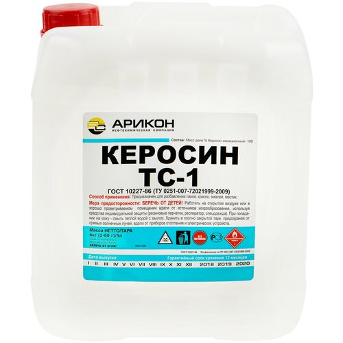 Керосин ТС-1 подходит для красок, шпаклевок, грунтовок на масляной основе (МА), зажигалок и керосиновых ламп, действует как обезжириватель. Обладает отличными эксплуатационными характеристиками: антистатическими и противоизносными свойствами, низкотемпературный, не имеет склонности к образованию отложений при высыхании или сгорании. Применяется для: - обезжиривания поверхностей деталей в электроремонтных и механических мастерских, - разбавления лакокрасочных материалов на основе олифы, битума, резинобитумной, сланцевой автомобильной мастики, - в бытовых нагревательных и осветительных приборах, в качестве топлива - в виде топлива для турбореактивных и турбовинтовых двигателей, смазки и хладогента для деталей топливных систем летательных аппаратов. Гарантийный срок хранения -3 года. Огнеопасно. Соответствует требованиям ГОСТ 10227-86. Страна производства - Россия. Объем - 5 л.