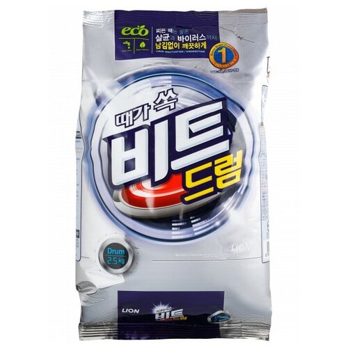 CJ Lion Стиральный порошок Beat Drum для автоматической стирки, мягкая упаковка 2,5 кгБезопасная стирка на основе пальмового масла - удвоено количество моющих компонентов на основе масла пальмового дерева и других высокопроизводительных растений, что делает стирку безопасной. В качестве основного моющего компонента (ПАВ) используется новый компонент MES- запатентованная разработка LION CORPORATION, JAPAN на основе пальмового масла. Благодаря своим высоким экологическим показателям и моющей способности данный компонент успешно зарекомендовал себя на рынке Японии.Быстрое и полное ополаскивание с технологией NSR - используется технология NSR (Natural Supreme Rinse)-технология естественного ополаскивания, благодаря которой происходит быстрое оседание пены и полностью вымываются остатки моющих компонентов. Не требует дополнительного ополаскивания.Антибактериальный, обеззараживающий эффект.Защита стиральной машины от накипи.Эффективная стирка при любой жесткости воды - эффективно отстирывает въевшиеся пятна и грязь при любой жесткости воды, используя малое количество порошка.Экологическая формула для защиты окружающей среды (высокая биоразлагаемость, способствование в снижении CO2 в атмосферу) и ресурсов (воды, электричества и времени).Использование: Предназначен для автоматических стиральных машин и для всех видов тканей, за исключением шерсти и шелка. Для белых и цветных вещей.