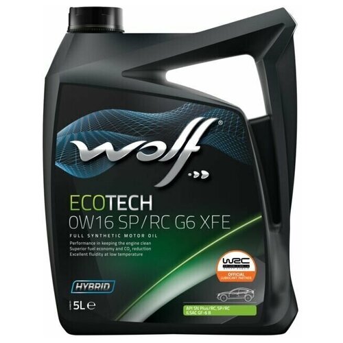 WOLF Ecotech XFE 0W-16 SP/RS G6. Благодаря низкой вязкости и превосходной текучести это масло значительно повышает топливную экономичность, снижает износ и выбросы CO2. Оптимизированный набор присадок предотвращает образование сажи и отложений и поддерживает чистоту двигателя. Применения Этот продукт был специально разработан для соответствия высоким требованиям стандарта ILSAC GF-6 B в отношении экономии топлива и контроля за выбросами CO2. Это масло обеспечивает уровень производительности, соответствующий требованиям пассажирских автомобилей с бензиновыми двигателями азиатских и американских производителей.Комплексная защита двигателя: эффективное поддержание чистоты двигателя. Экономия топлива: отличная экономия топлива и снижение выбросов CO2. Холодный запуск: превосходная текучесть при низких температурах.Это высокотехнологичное масло с низким коэффициентом вязкости и высокой степенью текучести гарантирует быстрый холодный запуск и значительно снижает износ, способствуя экономии топлива.
