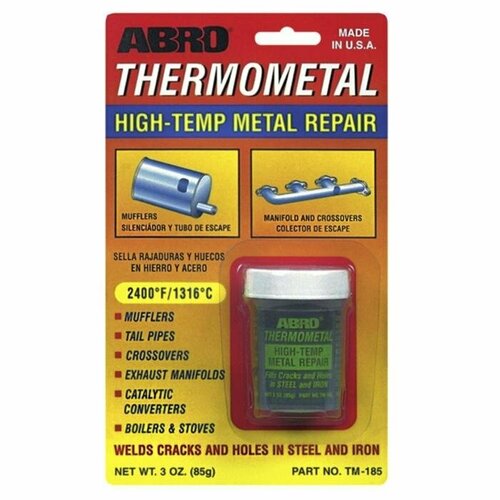 Термометалл Abro – это уникальный состав, способный значительно облегчить процесс ремонта и восстановления металлических деталей автомобиля. Продукт представляет собой смесь металлов, которые при нагревании способны заполнять любые неровности и трещины на поверхности металла, обеспечивая его прочность и долговечность. Используется в качестве холодной сварки для ремонта глушителей, выпускных коллекторов, крестовин, выхлопных труб, каталитических нейтрализаторов, котлов и печей, нагревательных бытовых приборов, сельскохозяйственного оборудования, корабельных двигателей и прочего. Преимущества: Выдерживает температуры до 1316°С; Сваривает трещины и отверстия в стальных и железных деталях; Обладает антикоррозийными и антиокислительными свойствами; Стоек к химическим продуктам; Легкий в применении, не требует смешивания нескольких компонентов; Безопасен для окружающей среды.