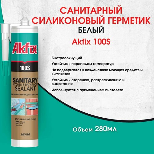 Санитарный герметик для кухни и ванной Akfix 100S, белый, 280 мл SA032 рекомендуется к применению при установке душевых кабин, заполнении швов в ванной комнате. Быстро сохнет, устойчив к перепадам температур.