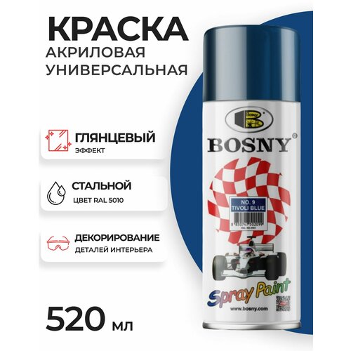 Аэрозольная краска в баллончике Bosny №9 акриловая универсальная, цвет синий, RAL 5010 (BOSNY NO. 9), 520 мл
