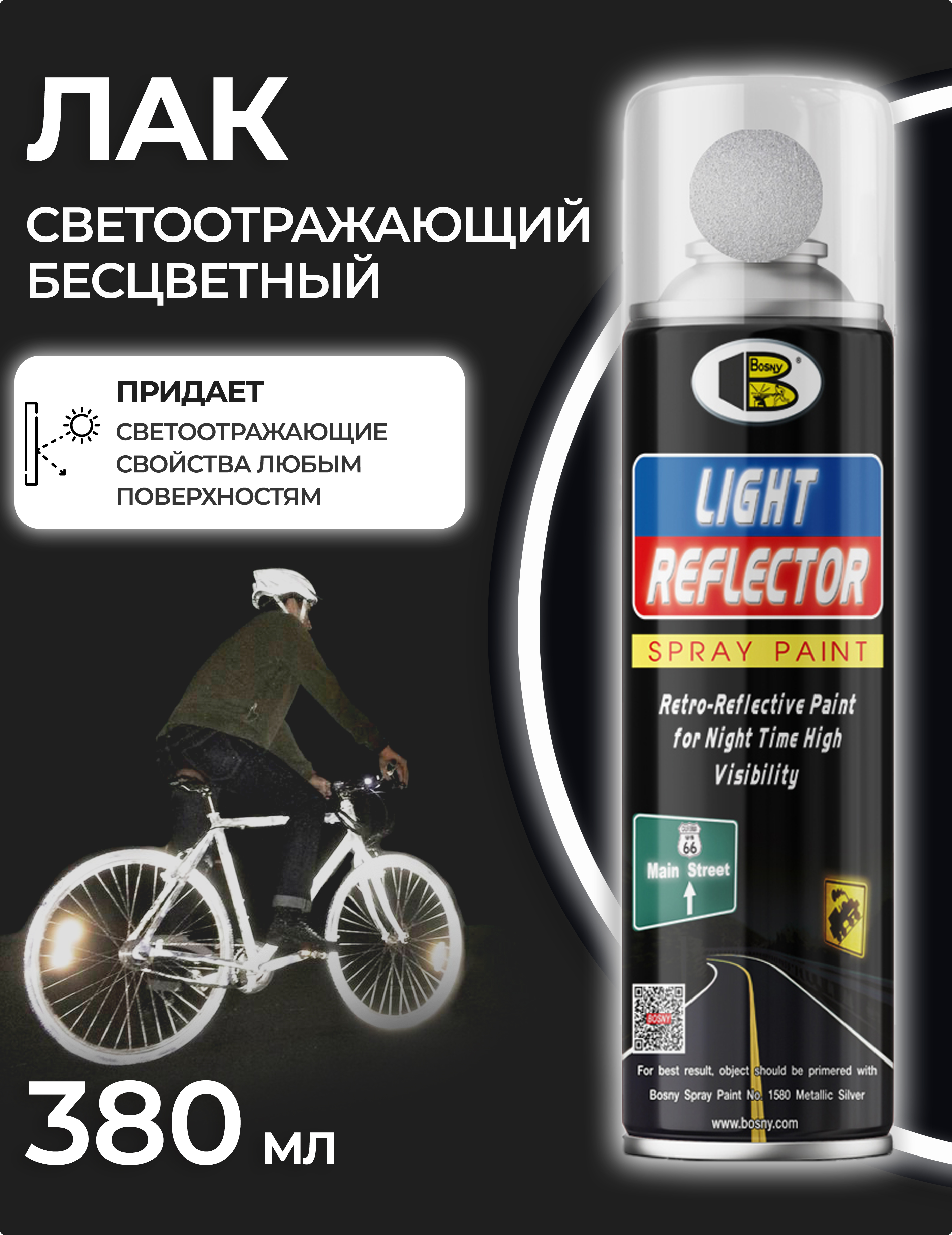 Светоотражающий лак средство для отражения частиц света с покрытой лаком поверхности. Светоотражающий лак идеально подойдет для окрашивания автомобилей, детских велосипедов, мотоциклетных шлемов, трафаретного письма, деколей и татуировок на автомобиле, маркировки сигнальных знаков, дорожных знаков, велосипедных и другого транспорта в общем, для всего, что нужно выделить в ночное время суток.Лак можно наносить на металл, пластик, дерево, пластмассу, стекло, керамику, и даже папье-маше, на предварительно загрунтованные и окрашенные поверхности.Лучше всего эффект проявляется на поверхностях, предварительно окрашенных серебряным металликом Босни. Лак, в зависимости от количества нанесённых слоёв, затемняет оригинальный цвет.